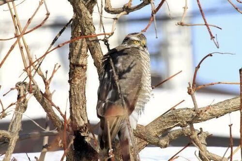 バードテーブルの餌を食べに来る小鳥を狙って今年も居座っているハイタカ 小鳥が捕まらないと歓迎する猛禽なんだけど・・・ まだ獲られた様子は見られないから腹ペコのハイタカ、、キョロキョロ!