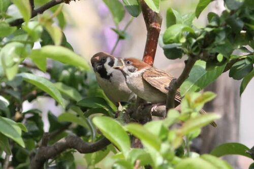 近所で生まれた雀の子 我家の庭に来てヂッヂッと低音で鳴きご飯のおねだりしている いい具合に枝の無い所で給餌していた^^b