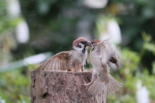 庭で子育て中だった野鳥たち、子どものために餌探しの戦い・・・。 雀と戦う
