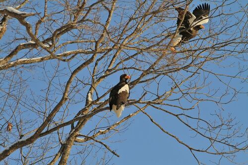 猛禽がなってる木、、、タイミング良かったら豊作のようになっている オオワシ1羽とオジロワシの若が2羽のようです オジロワシの若は嘴の先が黒いとか お前は行かないのか? じゃ、、あばよ またなっ!